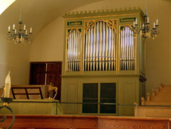 Im historischen Gehäuse ist das Hauptwerk untergebracht, im optisch in den Hintergrund tretenden Anbau das II. Manual und das Pedal.